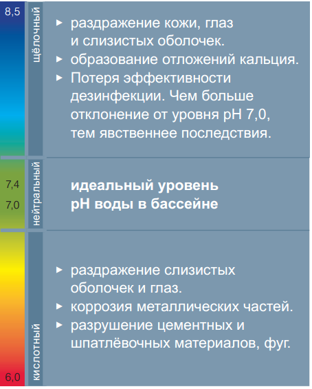 Уровень pH - это мера кислотности или щёлочности воды по шкале от 0 до 14. Нейтральное состояние находится в точке 7. Идеальный уровень рН воды в бассейне лежит в диапазоне 7,0-7,4. В жёсткой до очень жёсткой воде уже незначительное повышение уровня рН приводит к помутнению воды и отложению налёта кальция, и как следствие - трудновыводимые инкрустации. рН-Регуляторы от Chemoform являются необходимыми препаратами для правильной корректировки pH. Идеальный уровень рН - это предпосылка для оптимальной дезинфекции и флокуляции. Вне диапазона идеального уровня большинство дезинфицирующих средств теряют свою эффективность.
